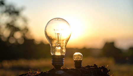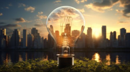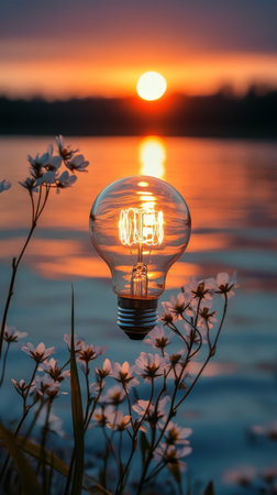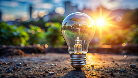 A light bulb glowing brightly among plants with the sunset in the background, symbolizing energy, ideas, and nature. Ideal for sustainability, creativity, and innovation themes.