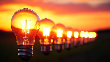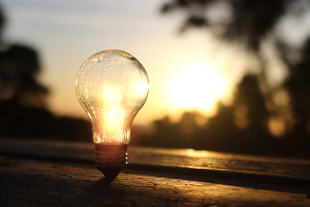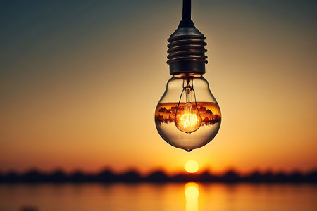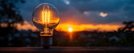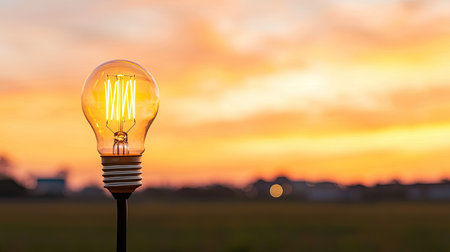 A glowing light bulb in focus with a blurred sunset in the background, symbolizing creativity, innovation, and bright ideas in a peaceful setting.