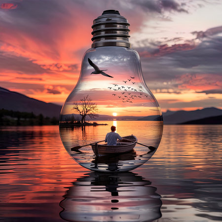 A tranquil scene featuring a reflective sunset lake inside a lightbulb, with a rower, birds flying, creating a calm and imaginative waterscape.