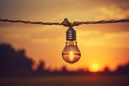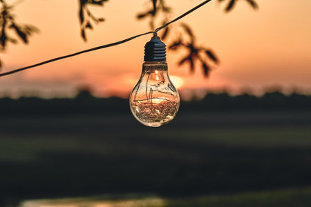 A light bulb emits a warm, bright glow as the sun sets in the background. The light creates a beautiful bokeh effect, highlighting the serene natural setting.
