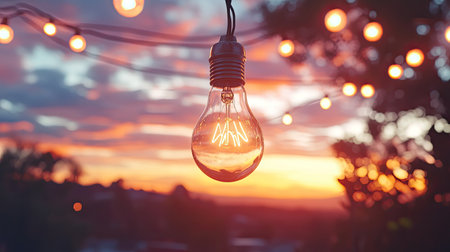 A vintage light bulb shines brightly against a stunning sunset sky, complemented by bokeh string lights, creating a warm, inviting atmosphere ideal for outdoor settings.