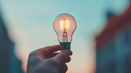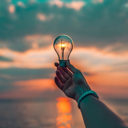 A hand elegantly holds a glowing light bulb against a stunning sunset backdrop, capturing the essence of innovation and inspiration through soft focus.