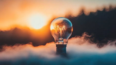 A stunning vintage light bulb glows brightly against a misty backdrop during sunset, capturing the essence of creativity and inspiration in nature's beauty.