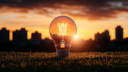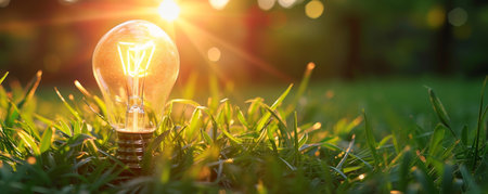 Light bulb glowing in grass at sunset, innovative and sustainable energy concept