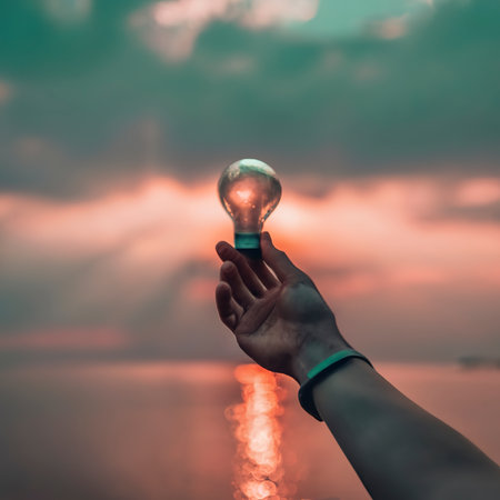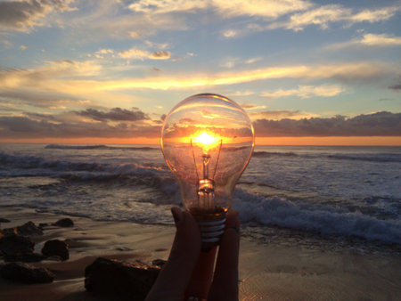 A gentle light bulb held against a breathtaking sunset over the sea and rocks, evoking feelings of tranquility and inspiration, perfect for creative or spa themes.