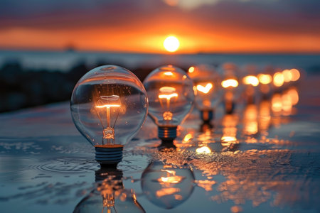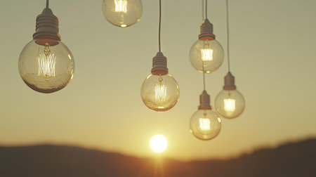 Suspended light bulbs with warm filaments glowing softly against a bright sky, each bulb reflecting hints of the sun's rays