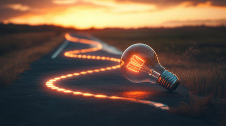 A glowing light bulb rests on a winding road at sunset, symbolizing creativity and innovation, inviting viewers to reflect on their journey and aspirations.