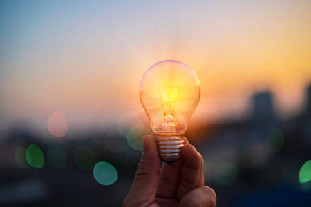 A hand holding a light bulb against a vibrant sunset, symbolizing innovation, creativity, and the power of ideas in a warm, inspiring light