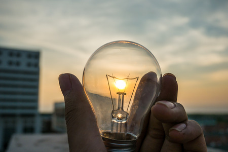 hand holding a light bulb with sunset power, sustainable development. Ecology concept