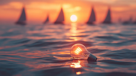 A broken lightbulb still glowing, floating in the ocean at sunset, with blurred sailboats in the background, creating a serene yet poignant symbol of fragility and hope