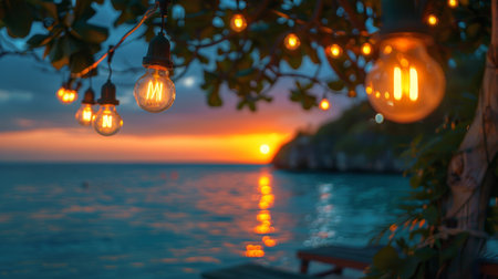 Three glowing light bulbs hang over a calm water surface with a dramatic sunset in the background. The warm light from the bulbs reflects on the water, creating a serene and inspiring scene.
