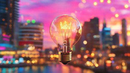 Night city scene with a radiant light bulb floating above skyscrapers, evoking innovation and visionary thinking
