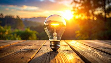 A beautifully illuminated light bulb resting on a wooden table captures the essence of nature, reflecting sunlight amidst lush greenery, creating a warm and inspiring atmosphere.