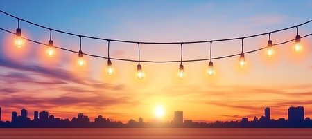 String Lights On A Sunset City Skyline Background, Perfect For Celebrations And Special Occasions