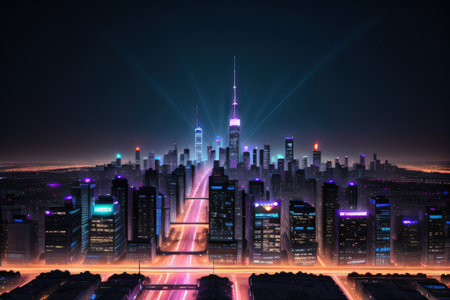 Nighttime cityscape: Skyscrapers illuminate urban skyline, a futuristic built structure generated by artificial intelligence