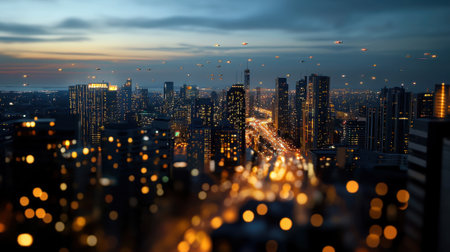 Aerial view of defocused city lights at dusk with copy space