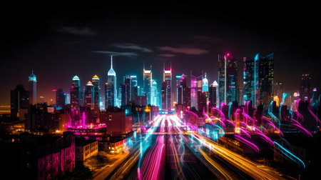 Captivating night cityscape showcasing illuminated highways and skyscrapers. The vibrant light trails create dynamic energy and movement.