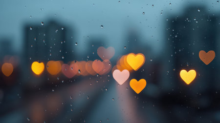 A unique abstract image showcasing hearts and raindrops on a window, creating a romantic atmosphere. This artistic depiction reflects love in an urban rainy scene.