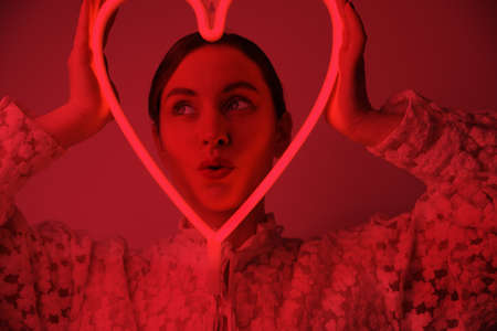 A contemplative young woman gazes slightly upward neon yellow wires framing her delicate face. The soft light creates an ethereal quality highlighting her thoughtful expression and.
