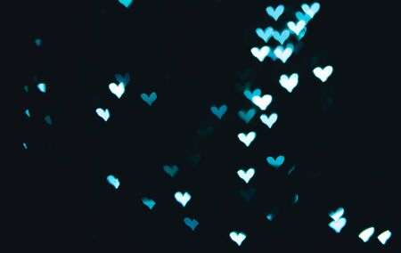 Blue Bokeh hearts in dark background. Valentines Day Card.