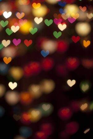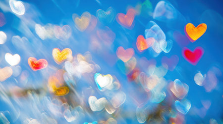 This vibrant and colorful bokeh background features scattered heart shapes, creating a dreamy and romantic atmosphere perfect for celebrations and creative projects.
