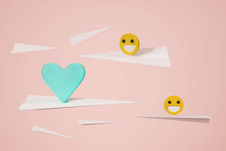 Flying letters, paper airplanes with heart, like and emoji icons. Concept of social media and online communication. 3D rendering