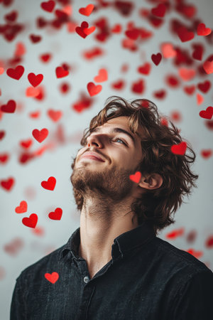 Heart-shaped confetti creates a romantic atmosphere against a dark backdrop