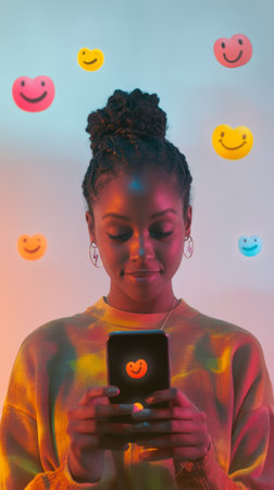 Young woman using a social media application on her smartphone, with colorful emojis floating around her, representing online communication and digital engagement