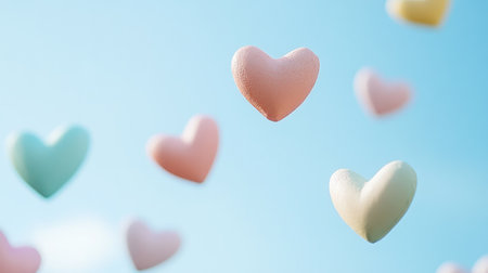 A group of small pastel-colored hearts floating gently on a light sky-blue background.