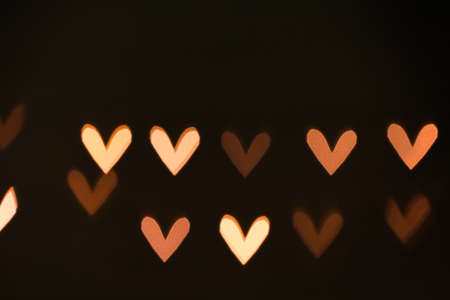 Abstract background of colorful hearts on black backdrop. Bokeh of defocused glitters, blurred pink and orange symbols of love. Festive wallpaper of holidays and celebrations, St. Valentines day
