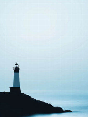 Lighthouse silhouette stands majestically on a rocky coast, surrounded by calm waters and a soothing twilight sky, offering a minimalist view.