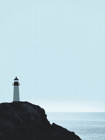 Silhouette of a lighthouse rises above the rocky coast, overlooking calm ocean waters under a twilight sky. Perfect for minimalist design.