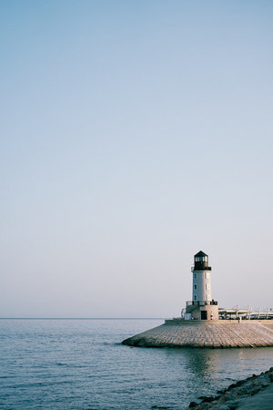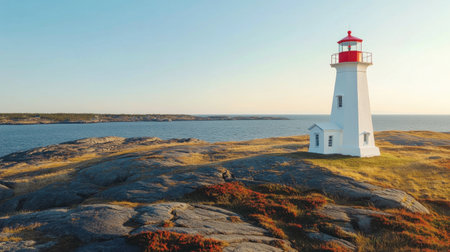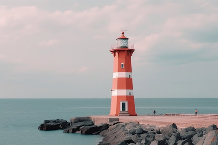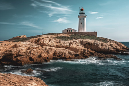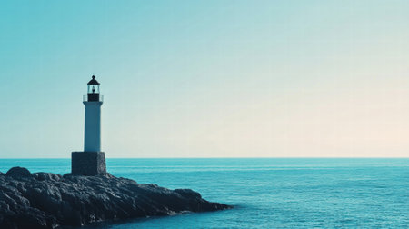lighthouse standing tall by the sea under clear skies, created with generative ai