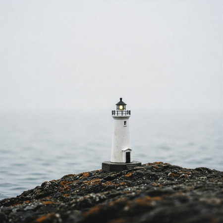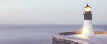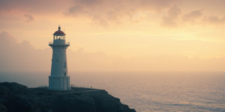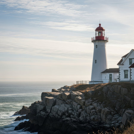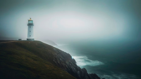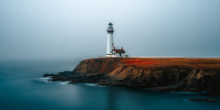 Coastal Landscape Featuring a Solitary Lighthouse Against a Misty Horizon and Tranquil Sea Views