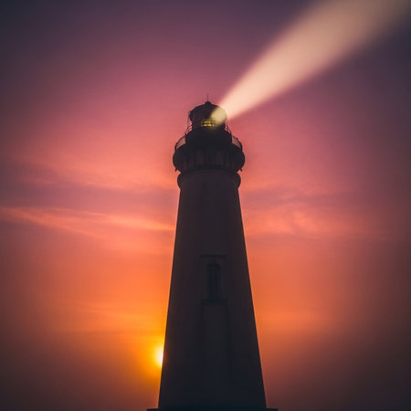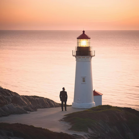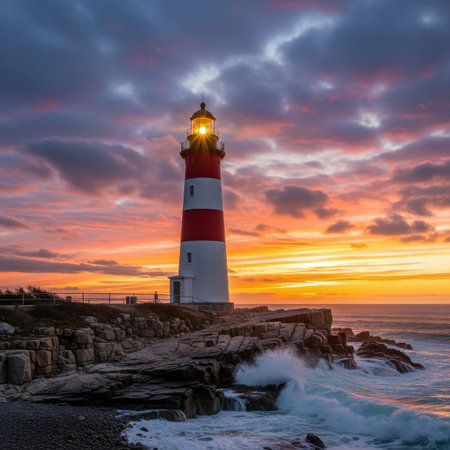 A picturesque lighthouse stands resilient on rocky terrain, illuminating the surrounding sea during a stunning sunset. The vibrant colors reflect tranquility.