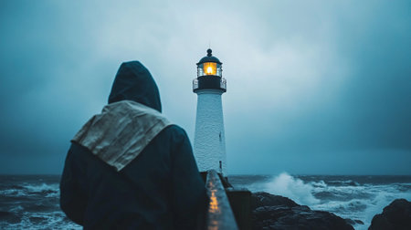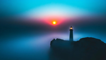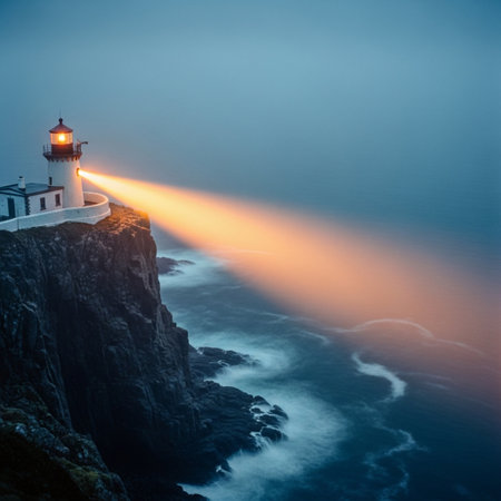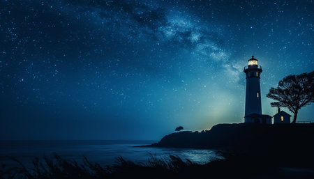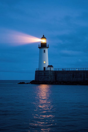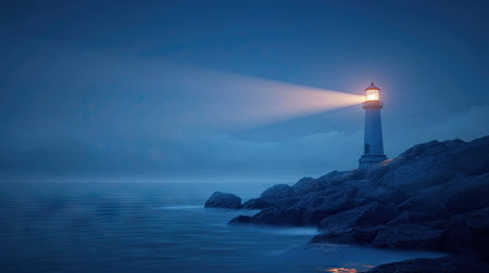 As twilight settles over the vast ocean, a steadfast lighthouse stands guard on the rocky coast. Its powerful beams cut through the deepening blue, a symbol of guidance, safety, and unwavering hope for those navigating the dark waters.