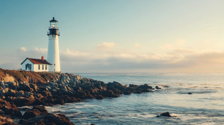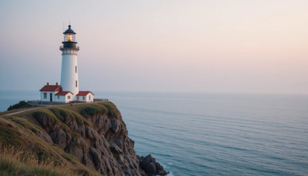 A stunning lighthouse positioned on a rugged cliff offers a breathtaking view of the calm ocean waters under a pastel sunset sky, embodying maritime beauty and tranquility.