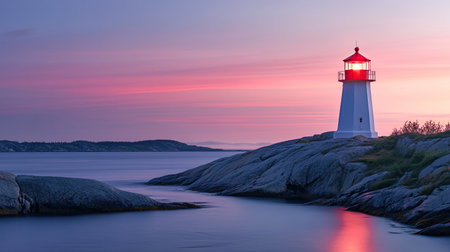 A lighthouse stands tall on a rocky coastline as dusk approaches its light glowing warmly in the fading daylight. The tranquil ocean stretches endlessly in the background.