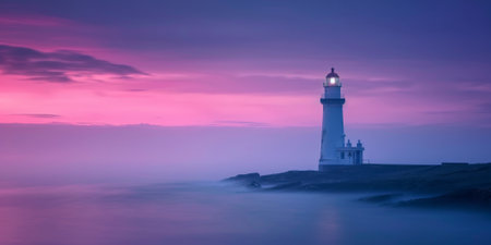A tranquil scene featuring a lighthouse standing proudly at twilight. The vibrant pink sky reflects beautifully on the calm water, creating a serene coastal landscape perfect for inspiration and tranquility.