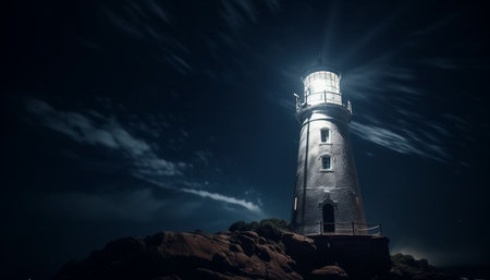 Guidance beacon illuminates dark seascape, old building exterior illuminated generated by artificial intelligence