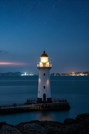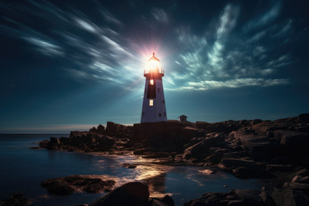 A solitary lighthouse shining its light across a dark, calm sea, providing guidance and safety during the night. High quality photo