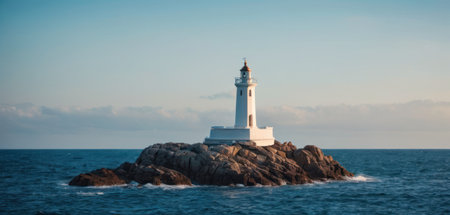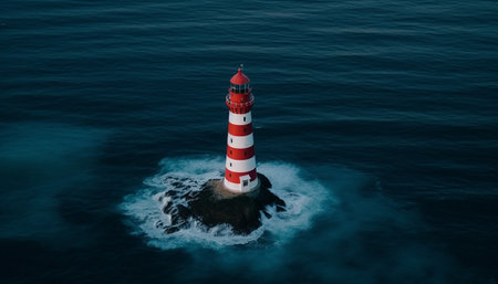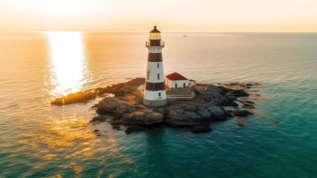 Isolated lighthouse on rocky outcrop in the sea Tranquil and resilient scene