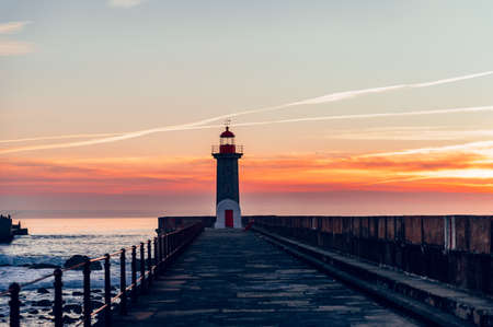 Stormy sea and lighthouse at sunset time. Beautiful natural background.
