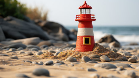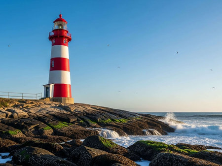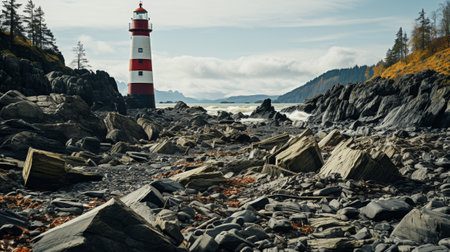 Red and white lighthouse on rocky coastline against blue sky, background, AI generated