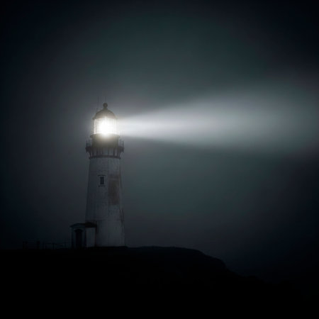 A lighthouse that illuminates the way in the thick night fog. Space for text