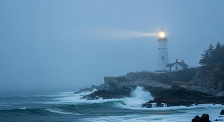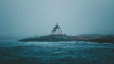 A solitary lighthouse stands resiliently on a rocky coastline, enveloped in mist. The turbulent waters reflect a serene yet majestic atmosphere at dawn.