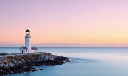 Serene coastal lighthouse sunset Travel and relaxation concept Minimalist coastal landscape featuring a solitary white lighthouse on rocky shore, pastel pink and orange