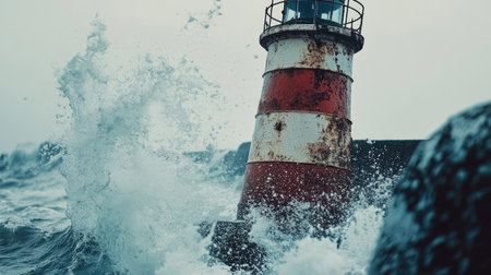 Beautiful red and white lighthouse on the rocks with strong sea wave AI generated image