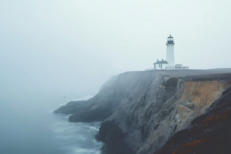 White lighthouse and adjacent house perched on a cliff, overlooking a foggy ocean, creating a serene and dramatic coastal scene