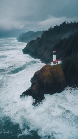 A lighthouse perched on a cliff watches over turbulent ocean waters. Waves crash dramatically against the rocks, while the sky is overcast, hinting at an early morning atmosphere.